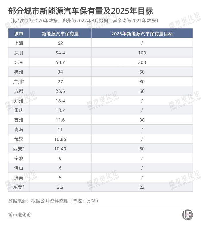 此外,汽车保有量全国前20位城市中,还有包括佛山、宁波、济南等在内的多个城市,2021年新能源汽车保有量不足10万。