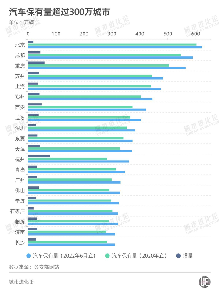 其中,北京汽车保有量达到622.4万辆,排名首位;成都、重庆汽车保有量分别为589.6、563.6万辆,分列第2位和第3位;苏州、上海、郑州、西安、武汉汽车保有量均超过400万辆。相比2021年底,武汉变化较为明显,从300万量级成功跃升至400万量级。