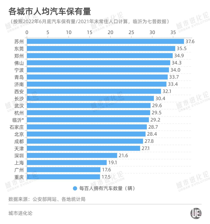 进一步看20座城市的人均汽车保有量,最高的是苏州,每百人拥有37.6辆汽车;其次是东莞和郑州,每百人分别拥有35.5、34.9辆汽车。最低的是人口基数最大的重庆,每百人仅拥有17.5辆汽车,广州、上海每百人也仅拥有17.6、19.1辆汽车,排名靠后。