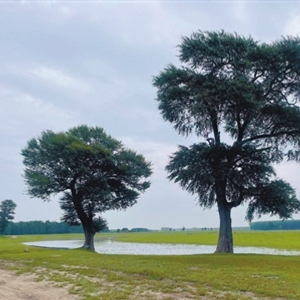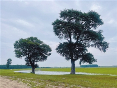 离开古渡口后向东继续行驶5分钟左右,就到了文章开头提到的那片引人入胜的草原。据当地人介绍,草皮都是天然生长的,没有人工的干预,草的高度刚刚及脚面,非常适合露营。登上过网络热搜的“夫妻树”,就生长在这里。还有展翅的灰鹤,也时常在这里歇脚,为画一般的景致增添了一抹亮色。而最让城里孩子感到惊喜的是,那些只在游戏“疯狂打地鼠”中见到过的豆鼠子,也是这片草地的主人之一。它们在草地上打了无数的洞,恣意地钻进钻出、尽情地撒腿奔跑,与一批又一批的露营者成了朋友。