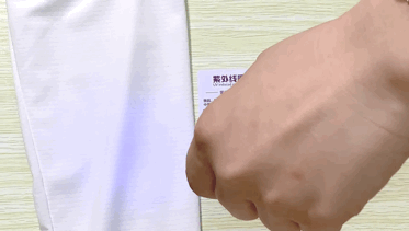 再来看看它的防晒力度,我们用紫外线灯光直接照射感应卡,盖了防晒衣的那面完全没变色,而无遮盖物的那边直接变深紫了。