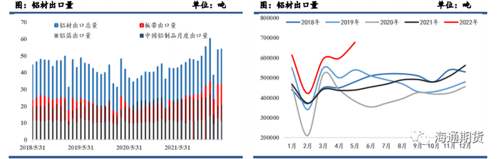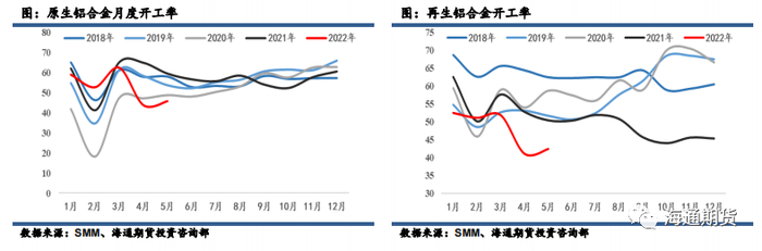 2022 年一季度铝材开工率呈现季节性的先跌后逐步反弹走势,但 3 月中旬后因持续受到疫情冲击影响较大,铝材行业开工率持续走低,5 月以来随着疫情逐步控制和复工复产的推进,开工铝逐步回升,但仍低于往年同期。分行业看铝板带开工率已恢复至去年同期水平,而铝型材、铝箔及再生铝合金开工率虽环比有所提升,但相比去年同期仍是偏低水平。