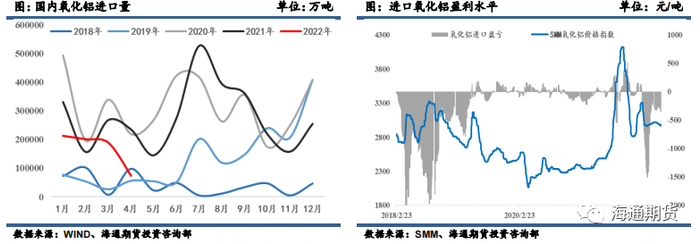 进出口方面,上半年氧化铝进口持续维持亏损状态,进口量持续下滑。2022 年 4 月我国氧化铝进口 7.35 万吨,环比减少 61.14%,同比减少 68.75%;净进口-9.42 万吨。1-4 月累计进口 67.68万吨,累计同比下降 31.72%。4 月出口氧化铝 16.77 万吨,环比大增 1190%,同比大增 1828%,创2019 年 1 月以来最高出口记录,其中出口至俄罗斯的氧化铝数量为 12.4 万吨,出口量大幅增加,反应出俄罗斯的铝原料受到澳大利亚限制出口政策的影响较大,若后续出口仍延续增加或将缓解国内产能的小幅过剩。