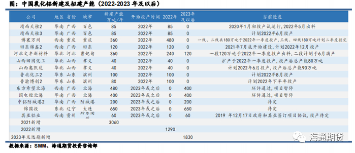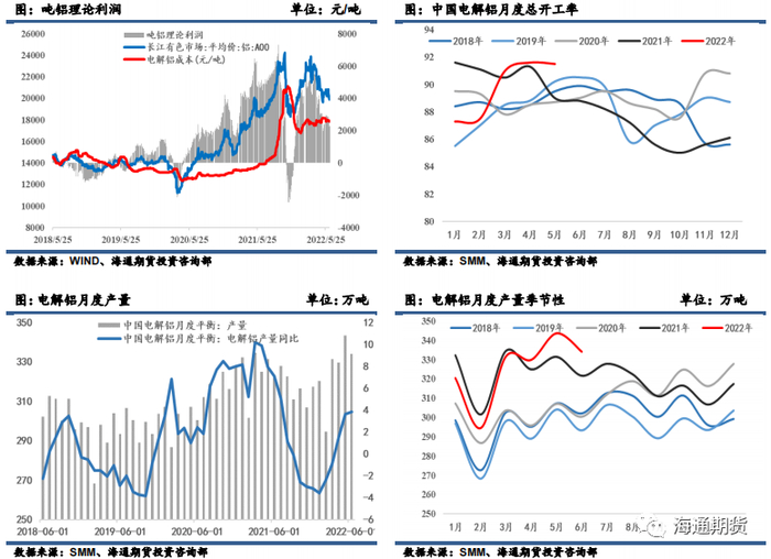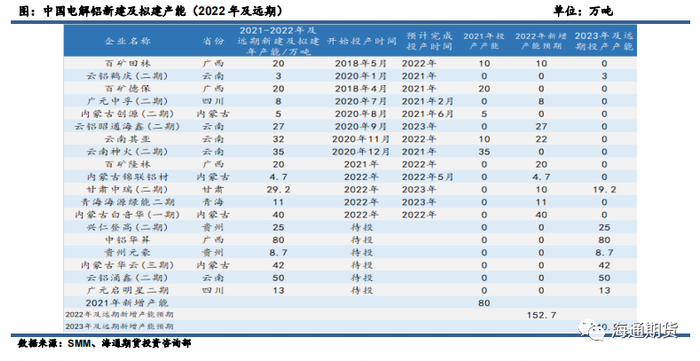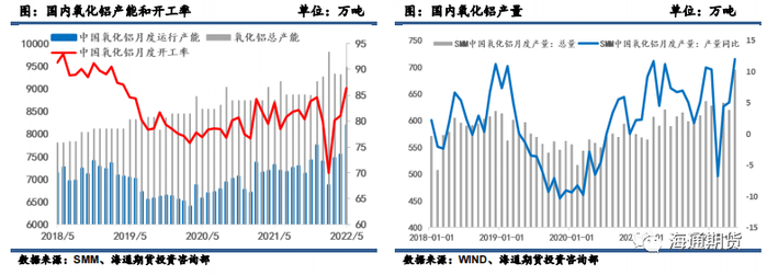 2022 年上半年氧化铝产能开工率呈现 V 型走势,主因在 2 月份受冬奥会和广西疫情影响大幅下跌。但因下游需求持续较好,企业开工积极性较高,3 月以来持续回升。据统计,截至 6 月中国冶金级氧化铝运行产能 8189.1 万吨/年,建成产能 9478.1 万吨/年,开工率 86.4%,较年初回升6.5%。我国 5 月冶金级氧化铝 695.5 万吨,冶金级日均产量 22.44 万吨,环比增加 12.16%,同比增长 12.02%;1-5 月累计氧化铝产量 3104.6 万吨,累计同比增长 5.16%。5 月估算氧化铝净进口-15 万吨,月内过剩 19.3 万吨,氧化铝基本面由短缺扭转为过剩。从投产看,三季度开始将有更大体量的新增氧化铝数量流入市场。截至 6 月初,新投产能方面靖西天桂二期项目 85 万吨已经满产,三期 85 万吨已经在调试中,计划 6 月投产;重庆博赛万州项目运行至 270 万吨,6 月将继续投产 90 万吨;河北文丰第一条线 120 万吨满产,第二条线正在运行,预计 6 月初满产;鲁北化工二期 100 万吨、鲁渝博创二期 100 万吨、广西田东锦鑫二期 120 万吨,均在今年下半年投产。后续新投产能投产速度加快且体量庞大,氧化铝远期基本面将保持过剩,但若氧化铝价格持续回落,山西和河南地区的成本高企的氧化铝厂压力骤增,或陆续出现减产压产的情况。
