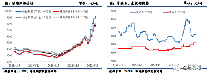 辅料方面,从 2022 年年初至今预焙阳极价格持续上涨。受采暖季限产、疫情等影响,叠加自身成本增加、供应受限和需求增长等因素驱动,阳极价格从 2 月份开始迅速反弹,连续创历史新高,是电解铝成本相对高位的主要原因。截止 6 月 29 日,各地预焙阳极价格维持在 7800-9172.5 元/吨之间,较年初大幅上涨 2900-3745 元/吨,冰晶石价格较年初上涨 1000 元至 7500 元/吨,氟化铝价格较年初下降 3100 元至 9400 元/吨。目前成本端石焦油多数炼厂已检修完毕恢复生产,市场供应增多,预计预焙阳极或跟随石油焦有一定回落空间。
