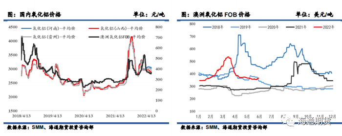 2022 年以来,国内氧化铝价格经过多轮反复,但整体上波动幅度较小,主要围绕 3000 元/吨上下波动,价格整体表现相对比较疲软,尤其是 5 月份到现在处于稳中有降的趋势。一季度主要受到国内环保、冬奥限产、广西突发疫情等影响减产 120 万吨,价格持续走强,而后随着冬奥结束和广西疫情得到控制,前期减产产能陆续恢复生产,价格逐步回落,但由于电解铝复产需求增加较快,支撑价格维持偏稳。海外波动幅度大于国内,主因 3 月俄乌冲突导致俄铝关闭乌克兰地区的Nikolaev 氧化铝精炼厂,涉及停产产能 170 万吨左右,同时澳大利亚暂停向俄罗斯出口氧化铝及铝土矿,后续海外价格随着澳洲氧化铝流入欧洲市场逐步回落。截止 6 月 29 日,山西、河南、贵州地区氧化铝价格分别为 2875 元/吨、3020 元/吨和 2950 元/吨,分别较年初价格小幅涨 40、185