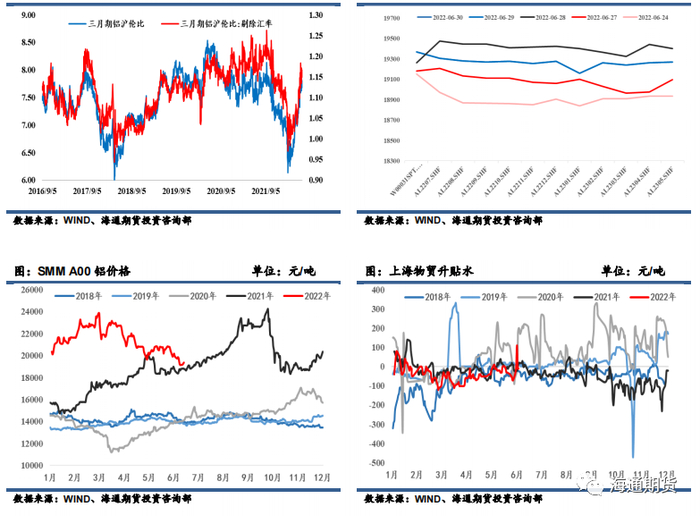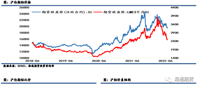 上半年伦铝和沪铝均先涨后跌,走出 M 型走势。前期上涨的主要逻辑是围绕供应端干扰展开的,一方面海外能源短缺欧洲铝炼厂陆续出现减产,而国内成本端氧化铝也受冬奥会减产预期增强;同时在 2 月国内广西突发疫情导致电解铝减产 42 万吨。另一方面 2 月下旬开始,海外俄乌冲突持续发酵并迅速激化,加剧市场对俄铝受制裁和海外铝供应的担忧。供应干扰推升铝价上行至 24195 元/吨的历史次高位,但三月初受伦镍极端行情影响快速大跌。从 3 月下旬开始,宏观层面上俄乌局势的边际影响逐步转弱,取而代之的是美联储流动性紧缩提速的预期,而基本面上国内突发疫情极大地抑制了下游需求,叠加国内电解铝产能复产节奏加快,铝价进入震荡下行通道。5 月初随着国内疫情好转和稳增长政策持续推出,需求回补预期逐步增强市场情绪有所改善,铝价呈现温和反弹走势。但随之而来的是美联储的超预期加息,市场焦点转移至衰退预期,铝价再次承压。截至 6 月 29 日收盘,沪铝主力合约收于 19805 元/吨,较年初下降 1100 元,跌幅 5.39%。伦铝与沪铝走势基本一致,走出了先涨后跌的态势,截至 6 月 29 日收于 2472.50 美元/吨,较年初下跌340.5 美元,跌幅为 12.1%。一季度持续外强内弱格局,内外比值持续下行,3 月下旬沪伦比值(剔除汇率)一度跌破 1,5 月下旬以来内外格局逐步转变为内强外弱,海外更多交易货币紧缩和经济衰退,沪伦比值有所修复。截止 6 月 29 日沪伦比值(剔除汇率)为 1.16,较年初回升 0.04。上半年国内现货升贴水受疫情和事件影响以走弱为主,沪铝月差维持小幅 back 结构。