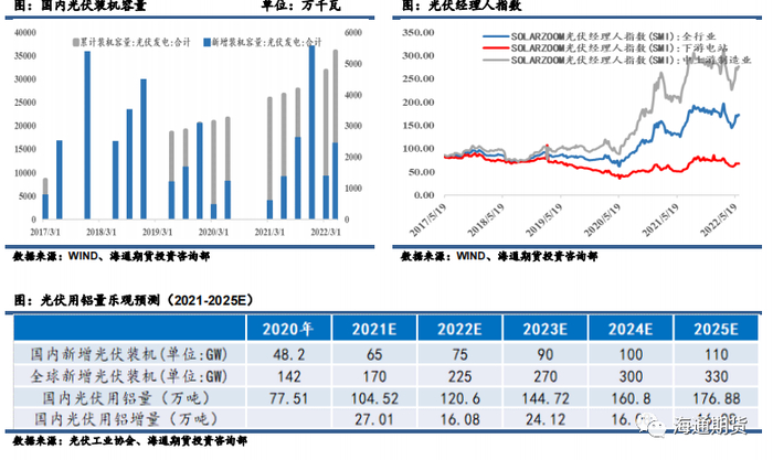 光伏方面,铝合金应用在光伏领域中主要用在光伏组件边框以及支架两部分,每 GW 光伏组件边框的耗铝量在 0.9-1.1 万吨,每 GW 电站建设所需光伏支架的用铝量约为 1.9 万吨。2022 年上半年光伏新增装机进一步增长。据国家能源局数据,1-5 月光伏累计新增装机 23.71GW,远高于去年同期,较去年累计同比增长 139.25%;5 月单月光伏新增装机 6.83GW,同比增长 141.34%。据 CPIA预测,预计 2022 年全球光伏装机 180-225GW,国内光伏装机 60-75GW,国内光伏用铝量约 120 万吨,未来光伏版块依旧为铝提供强劲的消费增量。中央财经委员会再次提到要加强交通、能源、水利等网络型基础设施建设,对光伏等新能源的发展提供了更好的政策环境,预计今年新增光伏装机
