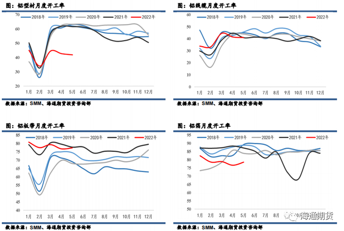 1、初端铝材:2022 年上半年受疫情冲击,铝材开工率低于往年同期