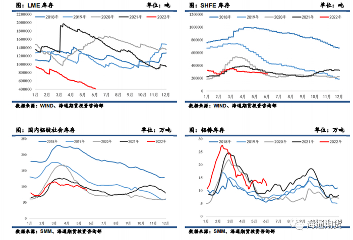 2022 年上半年 LME 和 SHFE 铝库存基本均处于持续去库的状态,其中 LME 库存回落幅度较大。截止 6 月 29 日 LME 铝库存 37.69 万吨,较年初的 93.92 万吨大幅降 59.87%,处于历史低位,注销仓单占比较年初增约 35.2%至 57.21%。国内社会库存在 1、2 月季节性累库,3 月下旬启动去库,但因受疫情影响下游需求减少和物流受阻,去库进程反复,铝锭和铝棒去库幅度均不及历史同期,但铝锭库存总量仍处近几年偏低水平。截止 6 月 27 日,国内铝锭社会库存 74.6 万吨,较年初的80.1 万吨小幅下降 5.5 万吨。6 月以来去库幅度加快,主因行业出现仓库重复质押事件,贸易商担忧情绪下加快提货速度,出库幅度明显扩大,因此当前的库存或不能完全体现供需关系。预计随着