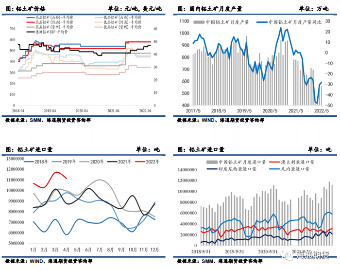 2022 年上半年以来铝土矿价格稳中有升,国产矿石供应偏紧。截至 6 月 29 日山西、河南、贵州地区高品位矿价格分别持平于年初的 580、580 和 475 元/吨,低品矿除贵州持平于 347.5 元/吨外,山西和河南地区分别上涨 12.5、5 元至 445 和 455 元/吨。澳大利亚 CIF 价格较年初上涨 3 美元至 47 美元/吨。产量方面,5 月我国铝土矿产量 559.92 万吨,环比增加 3.5%,同比减少 28.06%;1-5 月产量 2727.62 万吨,累计同比下降 34.71%,矿石产量逐年下降已成既定事实。国产矿石供给不足的问题从去年开始延续至今,5 月以来国内山西地区疫情得到控制,运输逐步缓解,积压在矿山的铝土矿开始发运到厂,矿石供应有所回升,但整体供给量依旧处于历年低位。一方面山西和河南地区因疫情矿石生产、运输受到影响需要购买外矿,同时贵州自 2 月以来安全检查未曾放松,当地矿石稀缺,部分厂家只能高价采购进口矿现货混合使用,才能勉强维系生产。进口方面,我国 5 月进口铝土矿 1197.39 万吨,环比增加 7.57%,同比增加 27.4%;1-5 月进口铝土矿 5580.73 万吨,累计同比增加 23.96%,进口矿石的依存度不断提升。5-6 月印尼再次提出将禁止铝土矿出口,虽然从去年 11 月禁令提出以来我国氧化铝厂已开始积极寻找替代矿石,但供应仍然面临一定的不确定性,有望增强电解铝的成本端支撑,后续进口结构或进一步向几内亚和澳大利亚倾斜。整体上国内矿石短缺叠加海外矿石现货采购难度加大,矿端偏紧格局难以改变,矿价仍保持稳中有升的状态。