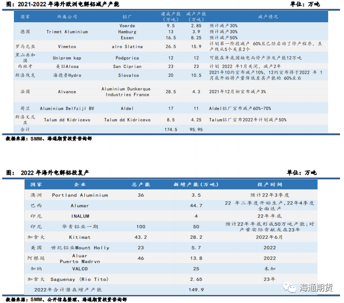 上半年海外产能干扰因素较多。去年年底到今年年初,欧洲地区因电价飙升预计导致 95 万吨左右电解铝产能减产,约占全球的 1.2%。另外俄乌冲突导致俄罗斯氧化铝供给短缺,或将对其电解铝生产带来一定影响,但目前尚未有实质性的数据,且我国氧化铝对俄罗斯出口量明显增加,预计俄铝实际影响偏小。截止目前欧洲减产产能维持,暂未有扩大迹象。但当前美国、澳大利亚面临电力短缺问题,两地区 2021 年的电解铝产能分别占全球 2.1%、2.2%,关注后期是否会影响到电解铝生产。另外当前俄罗斯向欧洲输气不稳定,自 6 月 16 日起俄罗斯天然气工业股份公司所属的北溪天然气管道因技术要求和保养维护原因,对欧洲国家的天然气输送量将下降近 40%,关注后期欧洲电价是否会继续上升。从投复产看,海外除欧洲以外的地区积极复产,2022 年预计海外可复产产能为 149.9 万吨,除了世纪铝业的以外,其他地区预计年底均能完成投复产,供应增量可以完全弥补欧洲前期的减产量,对价格形成一定的压力。