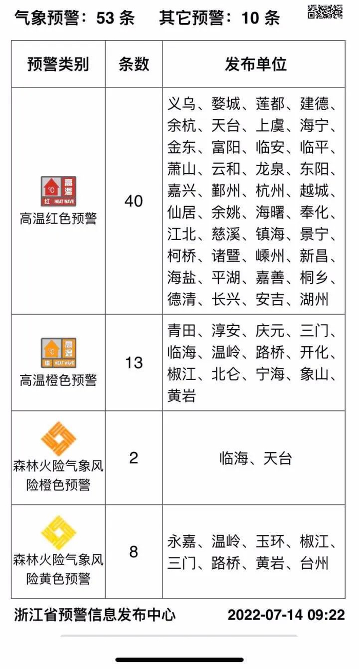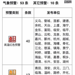 截至9时20分 浙江已发布40条高温红色预警
