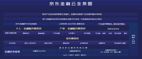 依托京东集团数智化社会供应链所联结的实体产业供应链,以及十年金融科技实战经验,京东金融云致力于为金融机构实现可持续增长的数智化服务,成为“联结产业供应链的数智化金融云”。论坛上宋可心对外发布了“京东金融云全景图” ,全面呈现从金融技术底座,到助力金融机构实现业务数智化、金融服务数智化的整套解决方案。