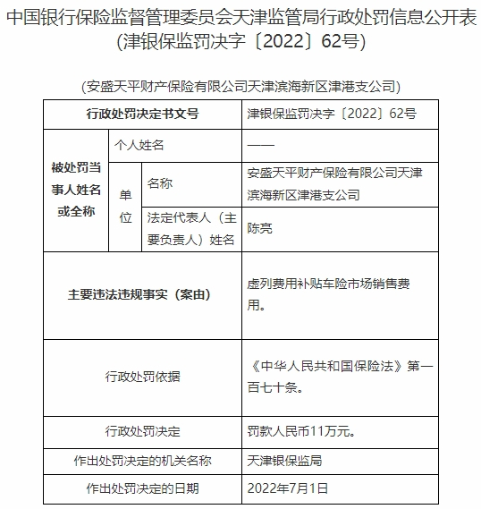 天津银保监局依据《中华人民共和国保险法》第一百七十条,对安盛天平财产保险有限公司天津滨海新区津港支公司罚款人民币11万元;依据《中华人民共和国保险法》第一百七十一条,对张健警告并处罚款人民币2万元。