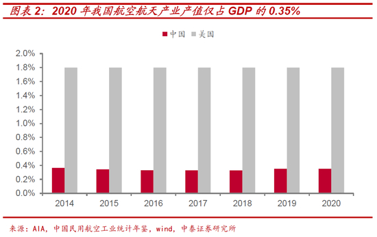 虽然我国装备制造业整体产值已经突破30万亿元,但我国航空航天产业整体规模仍然较小且发展较为缓慢。对比来看,2020年美国航空航天产业产值占GDP比重为1.8%,占美国出口额的%6.3%,而我国航空航天产业产值仅占GDP的0.35%,占出口总额的0.1%。从产业发展角度,相对于汽车、家电等产业,民用航空制造业是我国为数不多的未与国民经济同步发展的产业。