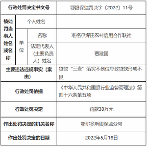 贷款“三查”落实不到位 准格尔煤田农信社被罚30万元