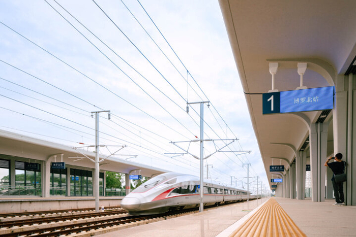 赣深高铁自江西赣州出发,一路南下途经河源,进入惠州境内首个站点——位于博罗县麻陂镇的博罗北站。站在博罗北站的月台,时速300多公里的高铁列车呼啸而过,眨眼工夫就“一骑绝尘”。“真的好快。”采访观察团的成员不禁纷纷感叹。