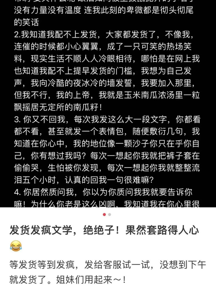 之后就是和店铺、客服漫长的扯皮过程,收货无望的消费者在苦苦等待中衍生出各种催发货的”疯话文学”应对客服的废话连篇,表达自己的无奈和不满。