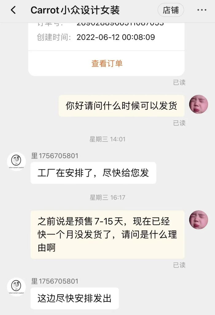 当然,对于迟迟不发货,商家也有自己的苦衷和理由。一名东莞的服装公司负责人对小编表示,生产一批100件左右的T恤,工厂需要7天左右的生产周期,再加上3天至半个月不等的打版,中间可能还会出现原料、物流问题,这些因素叠加就会导致店铺预售后却无货可发。