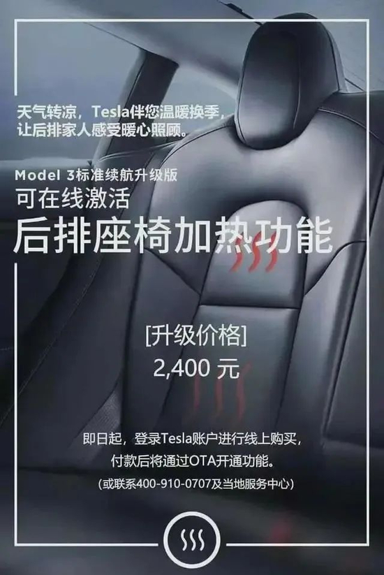 当然了,OTA 先驱特斯拉也干过上面这事,你买车的时候座椅里都预留好了加热丝,但是付费才能解锁。