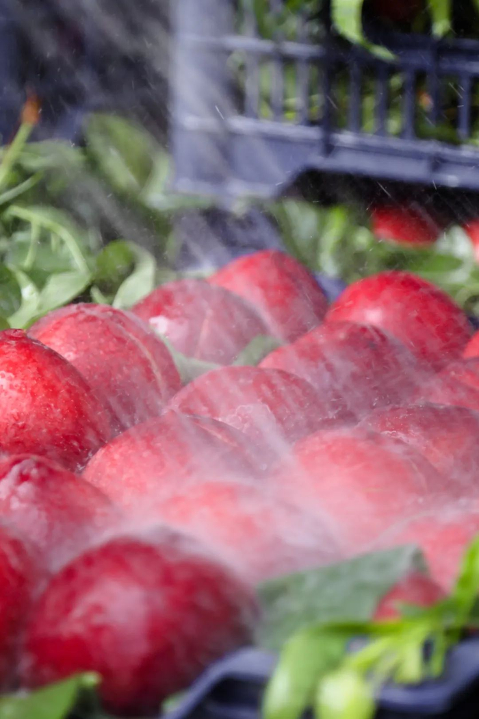 盛夏,山东枣庄人们正在洒水保鲜蜜桃。