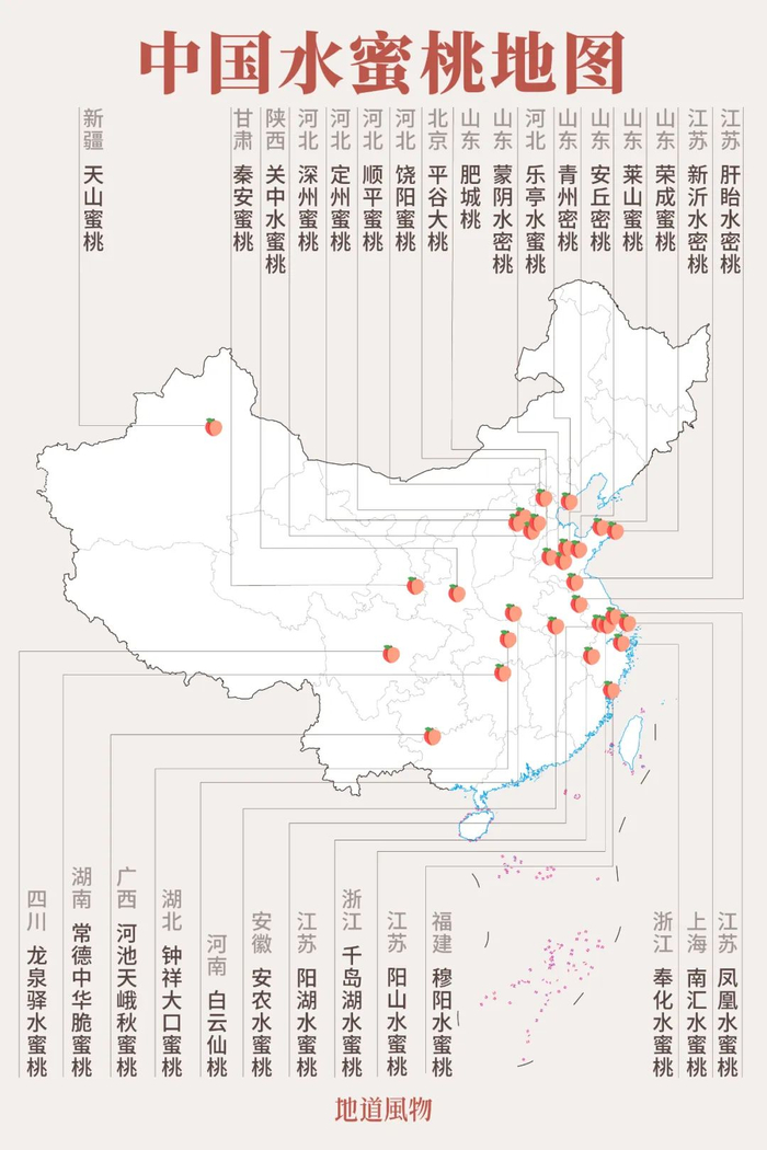 中国是世界桃子第一大国,水蜜桃是中国桃子的第一大类,从辽宁、山东到四川、云南,从江浙沪到陕西、甘肃和新疆,水蜜桃甜蜜了大半个中国。
