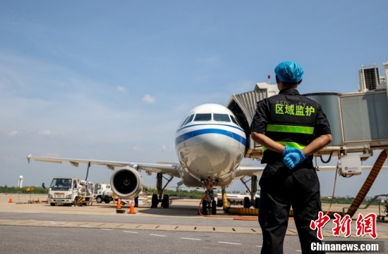 7月14日,机坪区域监护员对停机坪上航空器进行看护。正值暑运,武汉天河国际机场航班架次、客运量不断攀升。空旷的停机坪在烈日炙烤下酷热难耐,地面温度超过60摄氏度。为保障航班安全运行,机场工作人员头顶烈日、脚踏热浪,坚守在航班保障的最前线。 中新社记者 张畅 摄