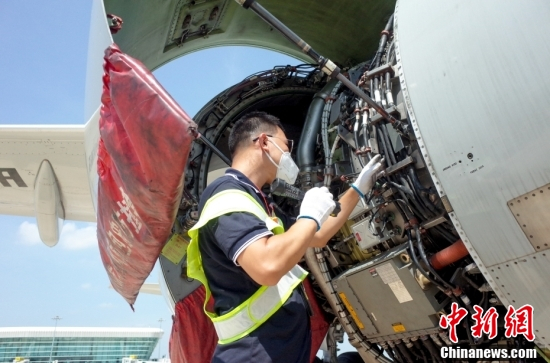 7月14日,机务维修人员对航空器发动机进行检查。正值暑运,武汉天河国际机场航班架次、客运量不断攀升。空旷的停机坪在烈日炙烤下酷热难耐,地面温度超过60摄氏度。为保障航班安全运行,机场工作人员头顶烈日、脚踏热浪,坚守在航班保障的最前线。 中新社记者 张畅 摄