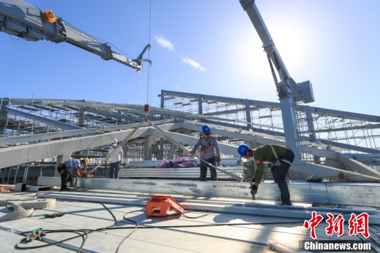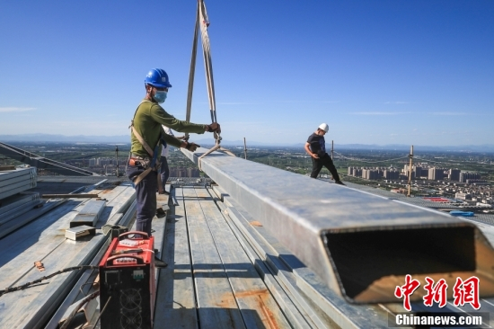 7月14日,正在建设中的北京远洋乐堤港施工现场,中建一局的工人在楼顶冒着高温加紧施工。当日,北京处于高温蓝色预警中。 中新社记者 贾天勇 摄