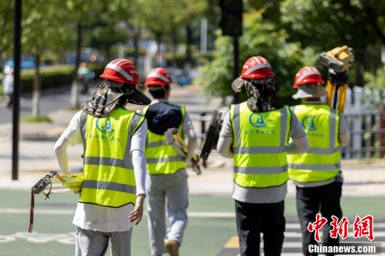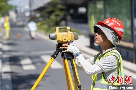 7月14日,浙江湖州,吴兴区北二环路附近,测绘员正顶着40度高温进行室外作业。当日,湖州市测绘院的工作人员,手持仪器顶着高温,徒步行走在车水马龙间,开展观测工作。 图片来源:视觉中国