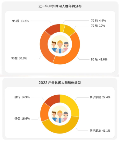 爱玩会玩的“90后”和“95后”新青年以44%的占比引领户外休闲潮流,“80后”作为亲子客群的主要构成部分,以41.6%的比例紧随其后。不同于男性占比稍高的传统登山、徒步穿越等户外项目,女性以66%的绝对优势在新户外休闲中占大多数。她们不仅乐于参加精致露营、桨板瑜伽、郊野徒步等休闲活动,对飞盘、腰旗橄榄球、棒球等竞技型的潮流运动同样热情高涨。