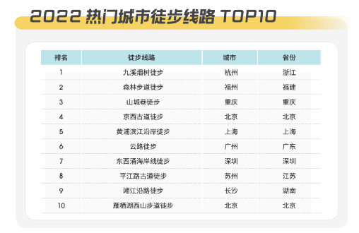 该报告通过马蜂窝社区用户的搜索、发布等行为数据总结发现,2022年热门的城市徒步线路前五名分别是杭州的九溪烟树徒步、福州的森林步道徒步、重庆的山城巷徒步、北京的京西古道徒步以及上海的黄浦缤江沿岸徒步。