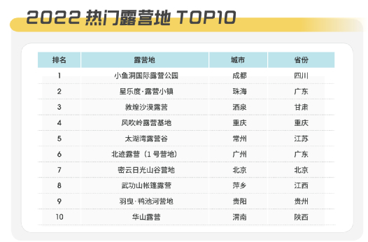 毫无疑问,露营已经火爆全网。报告给出2022年在马蜂窝平台上最受欢迎的10大露营地,其中成都的小鱼洞国际露营公园、珠海的星乐度露营小镇、酒泉的敦煌沙漠露营、重庆的风吹岭露营基地以及常州的太湖湾露营谷位列前五名。