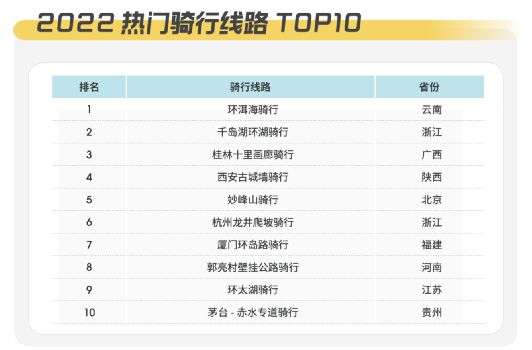 骑行也是今年风靡年轻群体之间的户外项目。CLUB100 创始人邹成认为,集运动、休闲和文化体验于一体的骑行运动的风行,与城市发展水平息息相关,目前北京和上海仍然是骑行运动的重镇。这里完善的城市绿道,可供骑行的公园及周边丰富的景区资源为骑行提供了良好的环境。马蜂窝旅行玩乐大数据显示,2020年至今,平台上关于骑行的数据已经增长108%,除了上班族的短程接驳,越来越多的年轻人周末去博物馆打卡、去网红店吃早午餐,都愿意选择骑行。报告显示,2022年热门骑行线路前五名分别是环洱海骑行、千岛湖环湖骑行、桂林十里画廊骑行、西安古城墙骑行、妙峰山骑行以及杭州龙井爬坡骑行。
