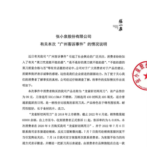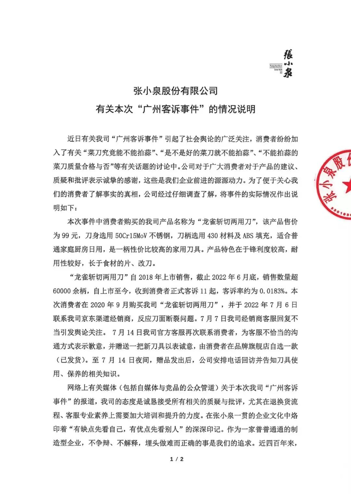 7月15日晚间,网络上热度颇高的“刀蒜大战致刀断”事件有了续集,张小泉官方发布了一则关于“广州客诉事件”的情况说明。