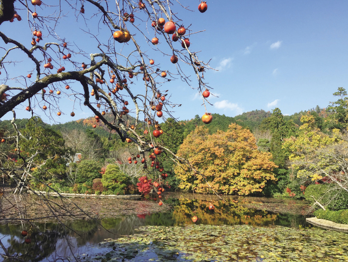 龙安寺,镜容池。 柿子垂下来。