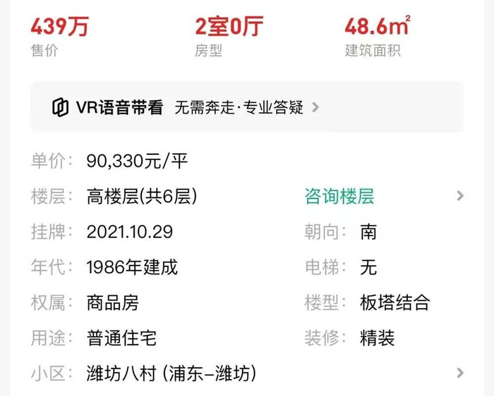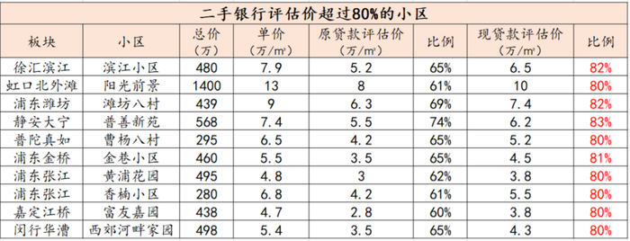 举个例子,位于浦东内环内的滩坊八村小区,一套48平总价439万的房源,单价9万/㎡,原银行评估价在6.3万/㎡,差不多是市场价的70%。