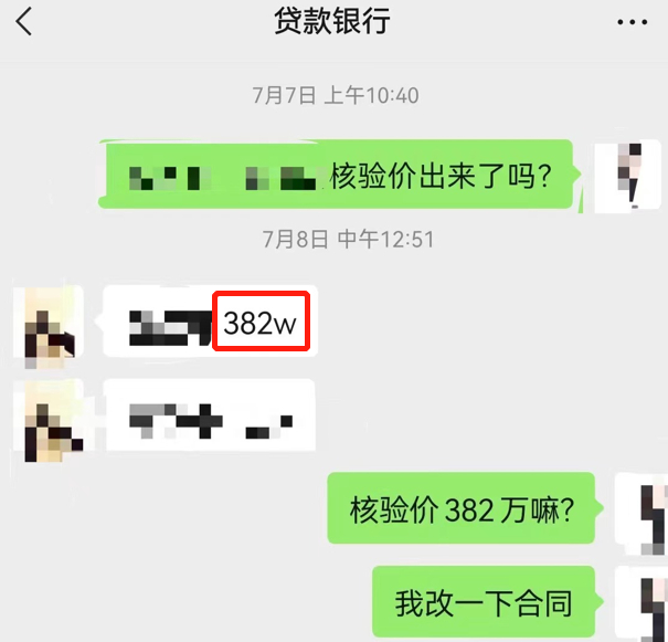 没想到的是7月8日银行评估价出来之后是382万,直接涨了42万,单价已经将近4.3万/㎡了。差不多是目前市场价的7成。