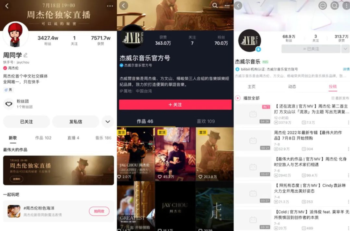 在平台方面,关于周杰伦的版权争夺一直以来热火朝天。据悉,2015年,周杰伦及其杰威尔音乐以850万的价格将版权授予网易云音乐后,在2018年授权费便涨至1818万;2018年,腾讯音乐更是高价拿下周杰伦的3年独家版权。而MV版权则在2020年授权给快手、抖音后,又于今年与B站达成战略合作,充分发挥了IP带动平台流量的影响力。