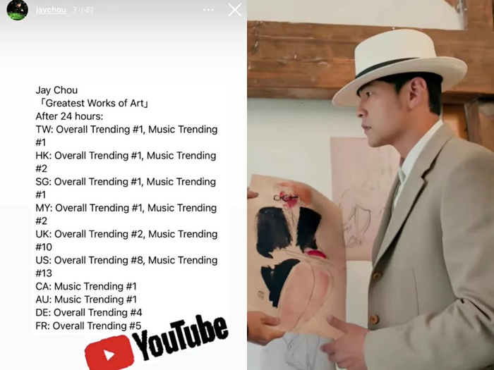 周杰伦也不忘贴出YouTube成绩分享,其分享快拍显示MV在发布24小时之后,便在YouTube上荣登台湾地区、香港地区、美国、英国、加拿大等多地总趋势及音乐趋势前列,上线3天后也在YouTube突破了1000万观看人次。