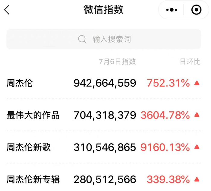 以微信来说,仅先行曲《最伟大的作品》MV发布当天,“周杰伦”一词的微信指数就达到了9.4亿之多,而“最伟大的作品”和“周杰伦新歌”也各超过7亿与3.1亿。朋友圈中不乏进行着分享周杰伦歌词、新歌感触、或是单纯跟风的存在。