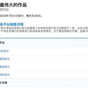 数据显示,在7月14日晚上10点,也就是正式上线的半小时后,售价30元一张的《最伟大的作品》数字专辑在QQ音乐、酷狗音乐、酷我音乐、咪咕音乐等总销售额破亿元。