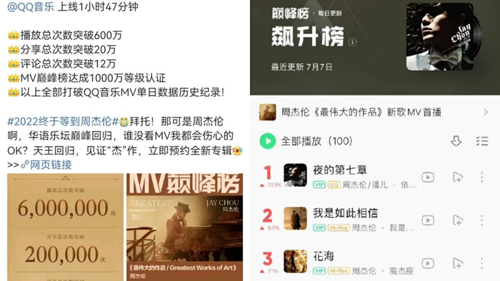以先行曲《最伟大的作品》MV上线为例。公域流量中,这支MV在首次达成合作的B站上9小时22分便斩获千万播放量;紧随其后的QQ音乐,更接连在当日认证了MV打破了站内MV播放总次数突破600万、分享总次数突破20万、评论总次数突破12万及单日一千万认证时间记录,甚至还出现了包含新歌和过往音乐作品共95首占领QQ音乐巅峰榜之飙升榜前百席位的壮观场面。