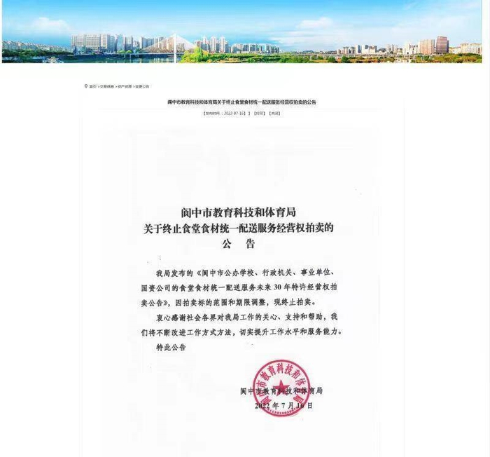 2022年7月16日,界面新闻从四川广安天晟拍卖有限公司(下称天晟公司)获悉,原定于7月19日举行的“阆中拍卖175 家单位食堂配送经营权”计划已经终止。