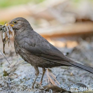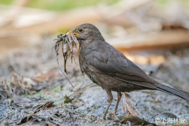 乌鸫叼着水边潮湿的水草等植物作为巢材(摄影:@郑运祥)