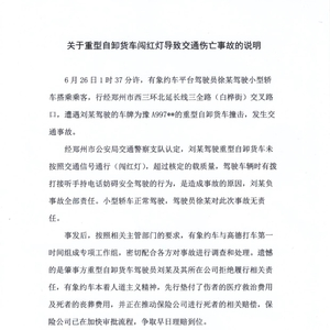 中新网7月16日电 16日,有象出行微博账号发布关于重型自卸货车闯红灯导致交通伤亡事故的说明:6月26日1时37分许,有象约车平台驾驶员徐某驾驶小型轿车搭乘乘客,行经郑州市西三环北延长线三全路(白桦街)交叉路口,遭遇刘某驾驶的车牌为豫A997**的重型自卸货车撞击,发生交通事故。