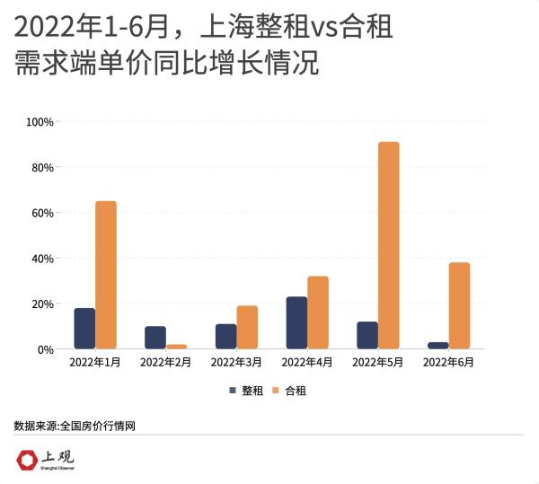 5、6月份,需求端关注的合租房均价同比去年上涨幅度达到91%、38%,而相比之下,需求端关注的整租房均价在6月份只上涨了3%。