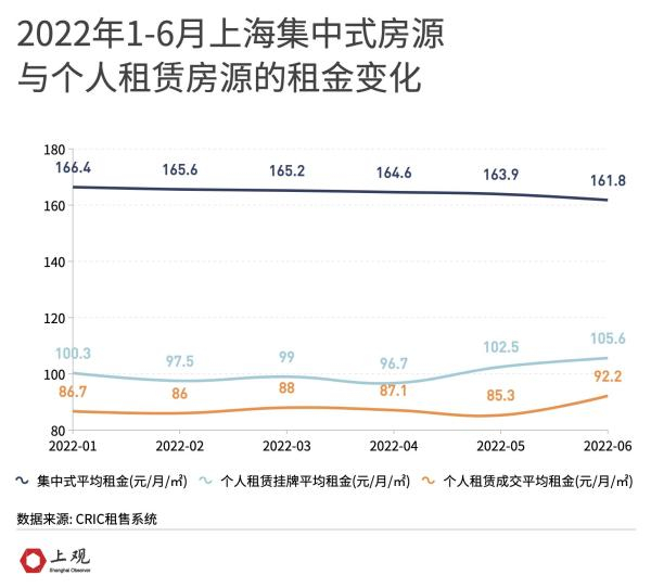 6月,上海个人租赁房源的挂牌租金单价环比上涨了3%,成交租金单价则环比上涨了8%。而6月长租的集中式房源租金单价则环比下降了1.3%,相对年初每平米也跌去4.6元/月。