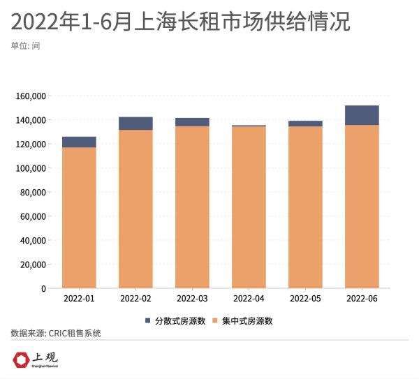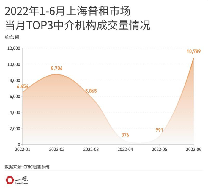 根据cric租售系统的数据统计,6月上海普租市场当月top3中介机构的成交量达到10789间,环比5月份上涨了近10倍,也显著高出疫情前的成交量。